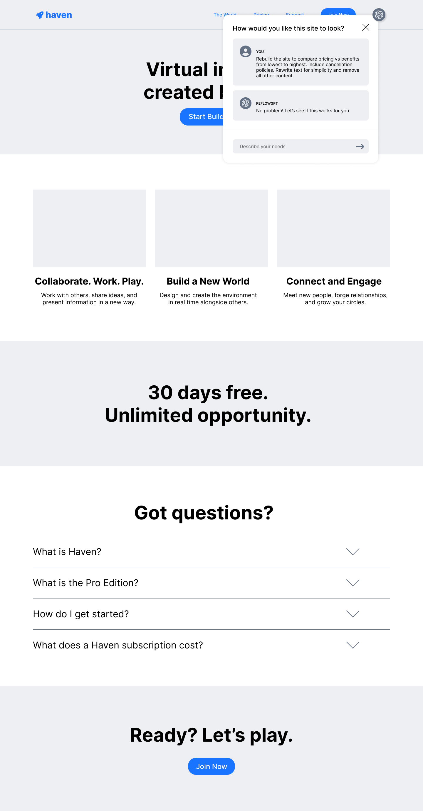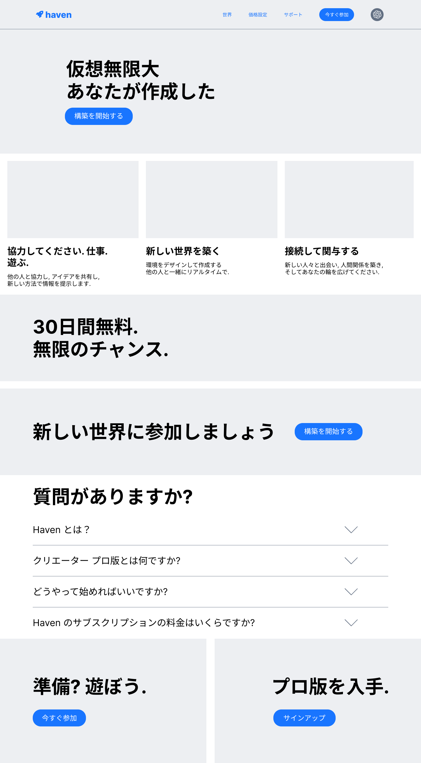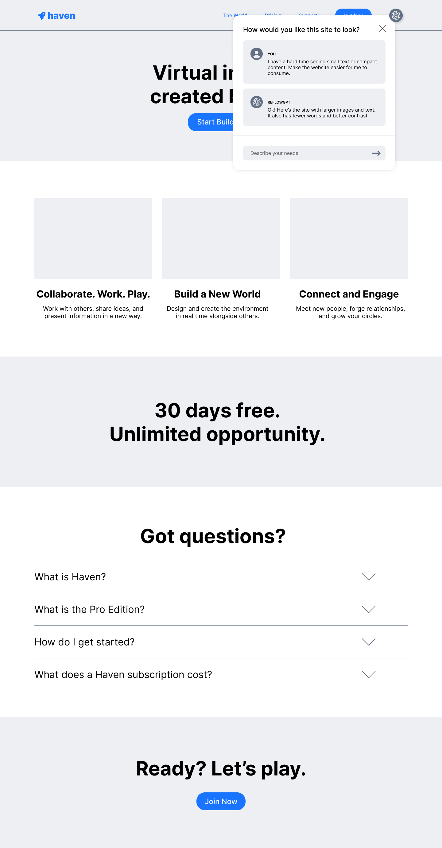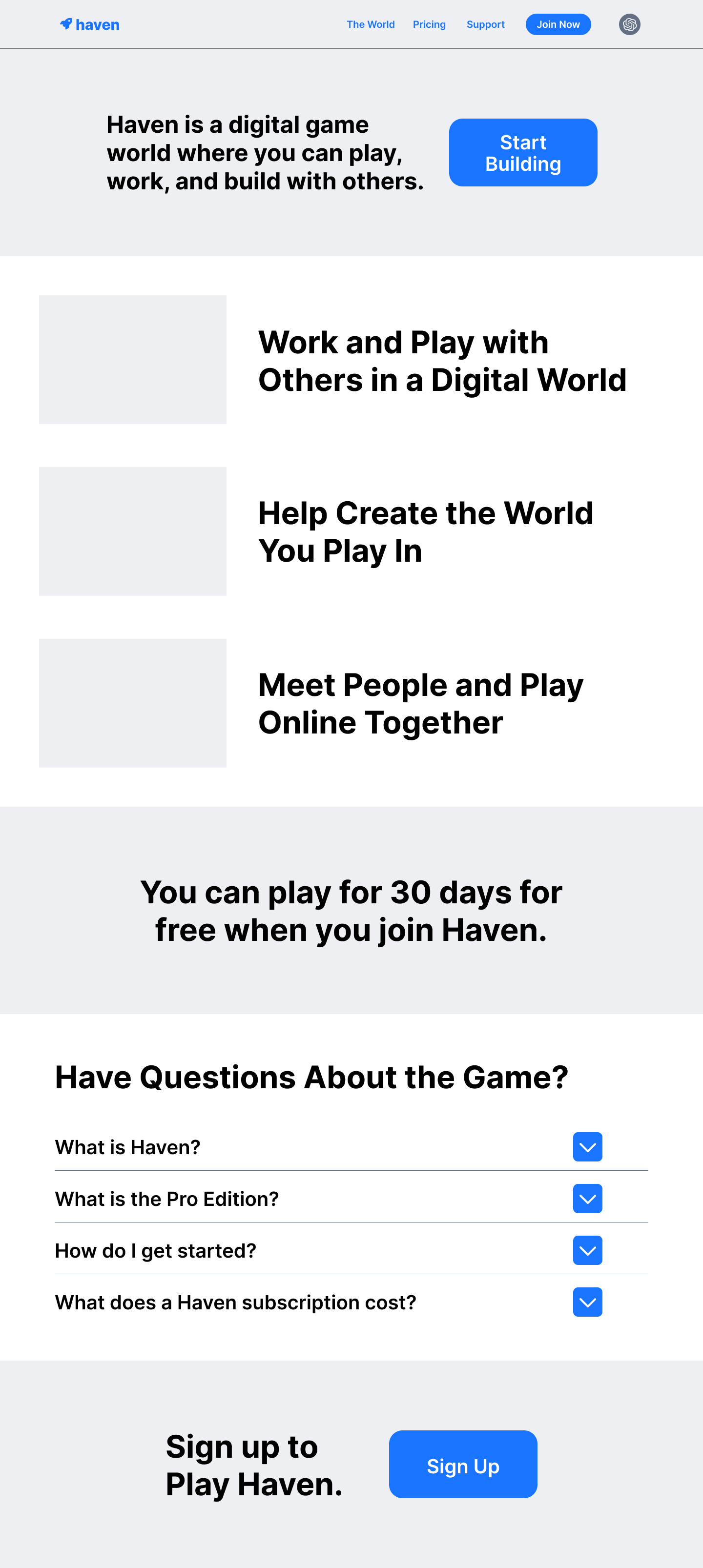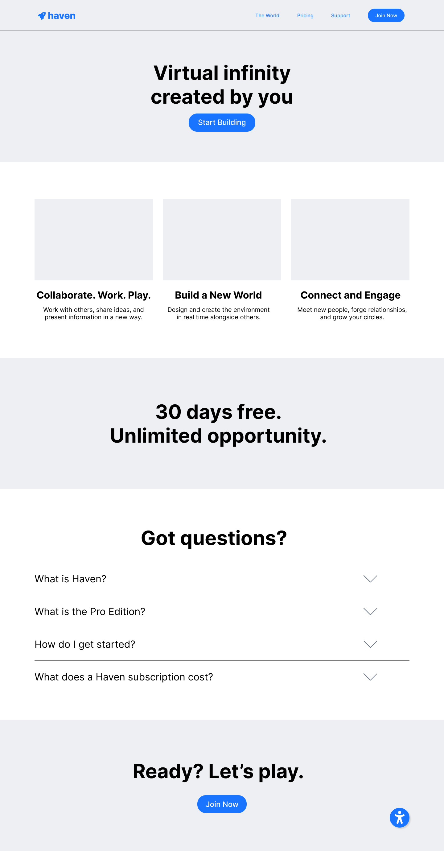 Here’s a website wireframe for a faux metaverse company called Haven. It features all the standard components of a standard website, such as top-level navigation, hero and CTA banners, product feature boxes, and even a floating icon for accessibility settings.