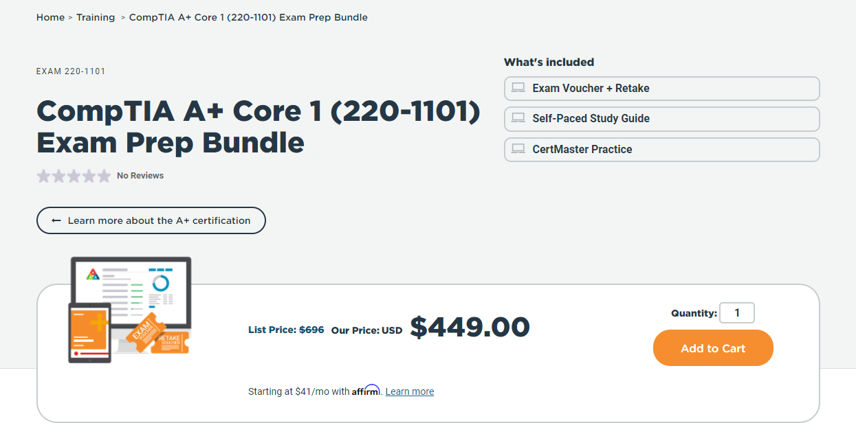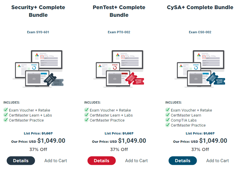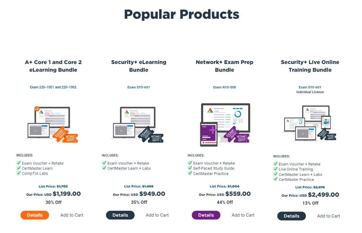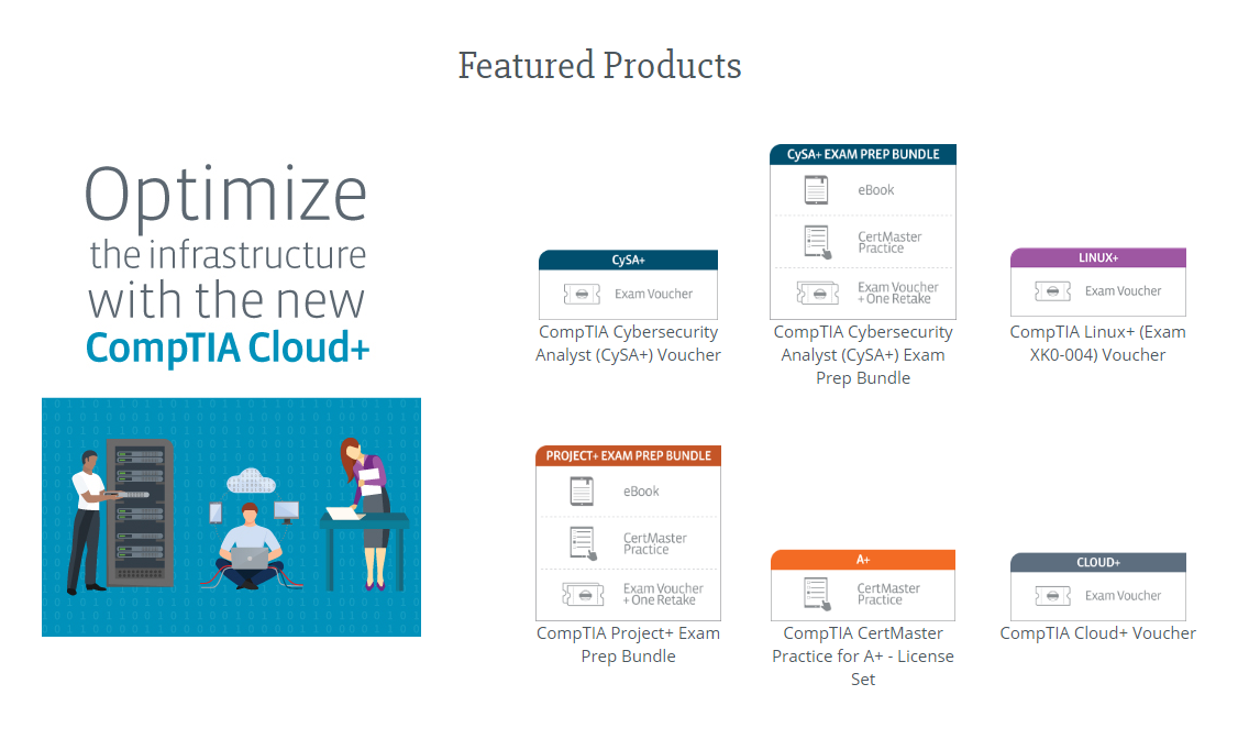Featured Products (Old): A featured products webpage area within the old CompTIA website, showcasing the old product and bundle cards.