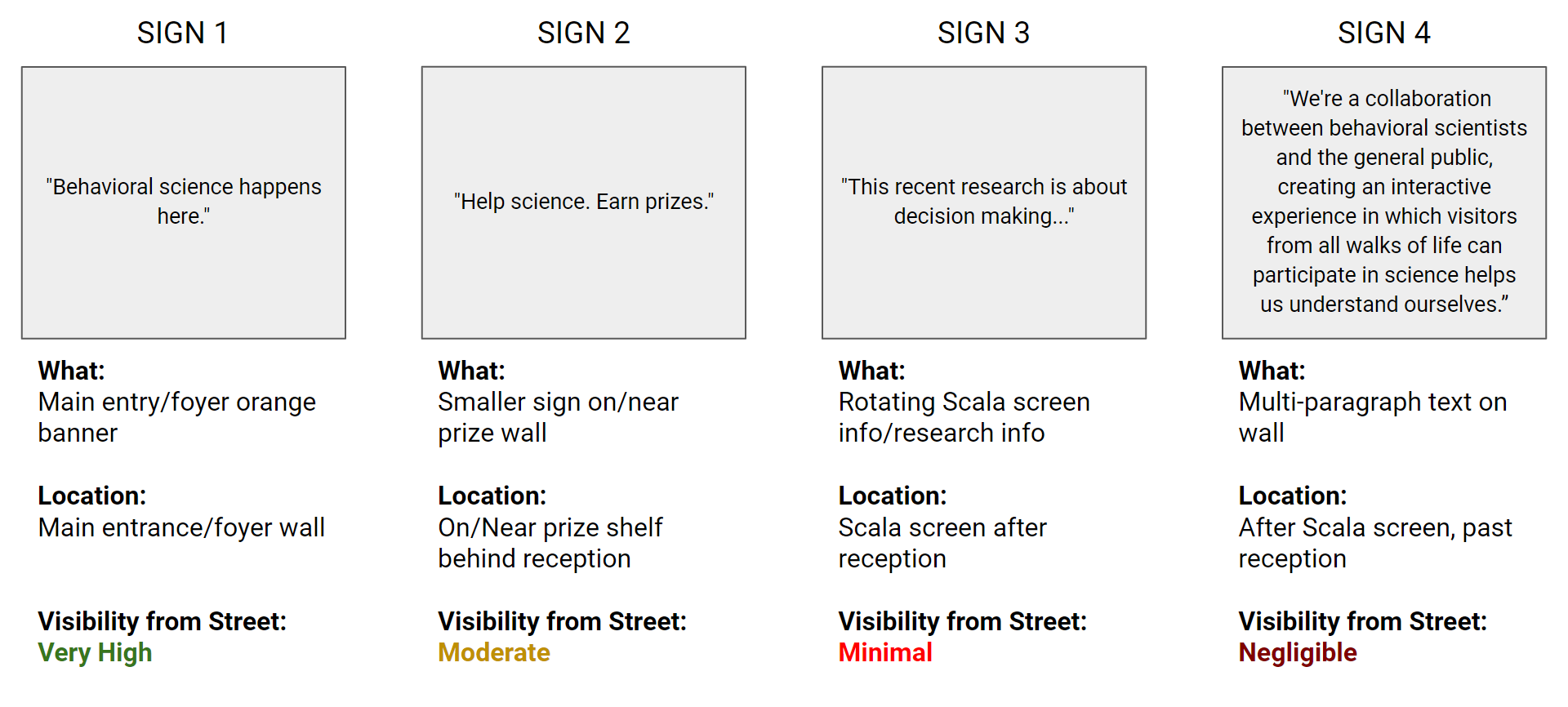 The 4 Signs: Used for research and understanding their perception as a viewer from the sidewalk.